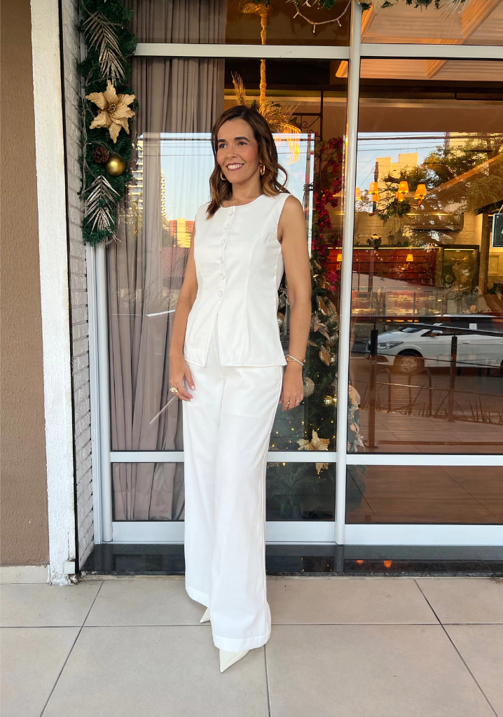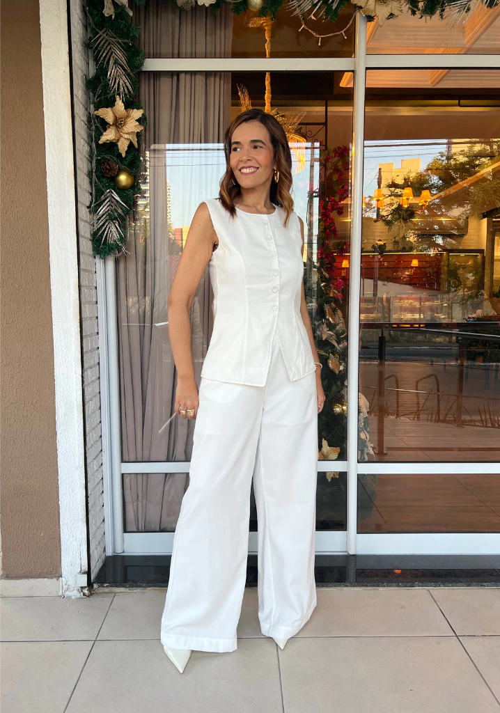 A blusa Astrid tem corte mais arredondado e próximo ao pescoço, deixando o colo mais coberto.