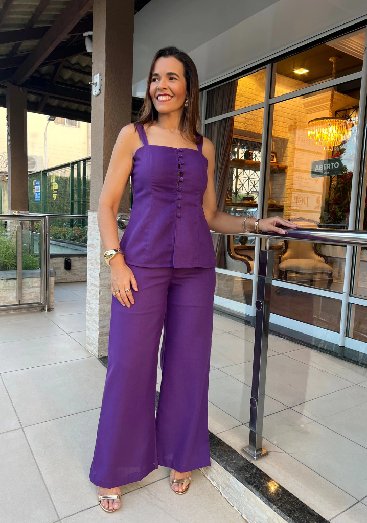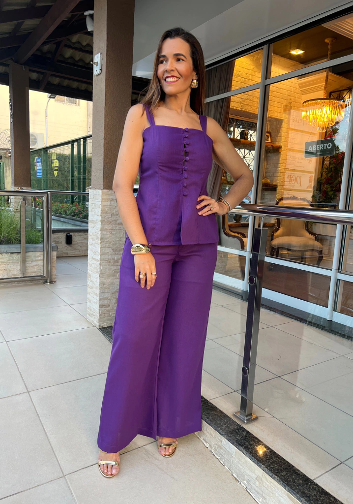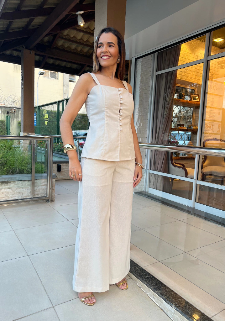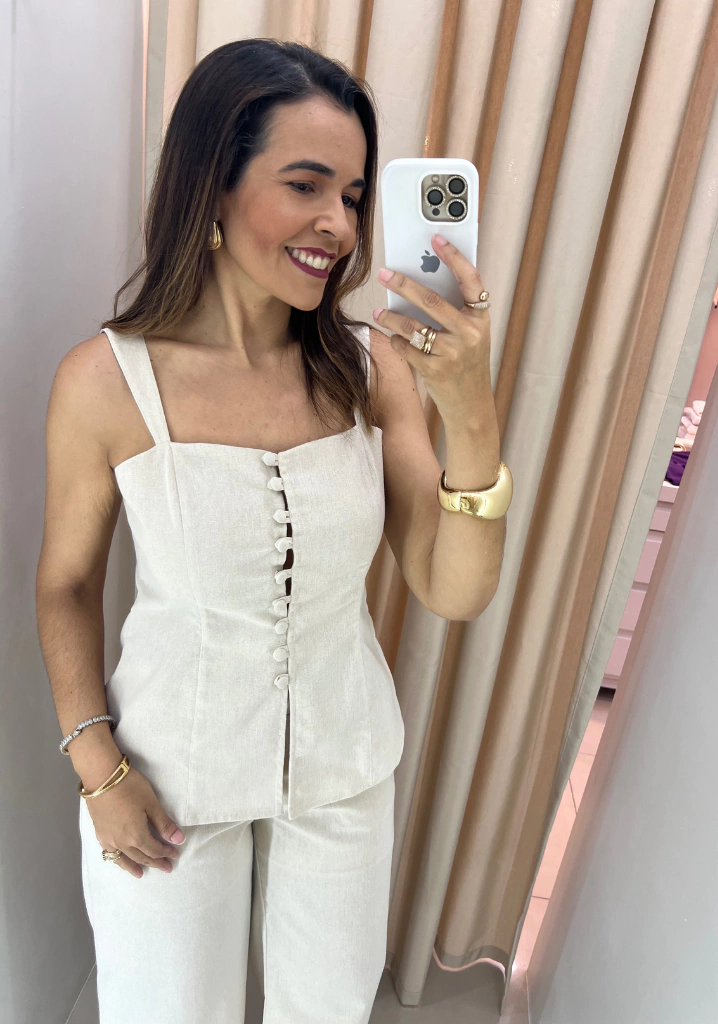 Esta blusa alongada destaca-se pelos botões cobertos, que adicionam um toque de elegância discreta, e suas alças largas que garantem conforto e segurança ao vestir. Confeccionada em uma mistura premium de linho com viscose, oferece uma textura leve e fresca, perfeita para os dias quentes do Brasil.