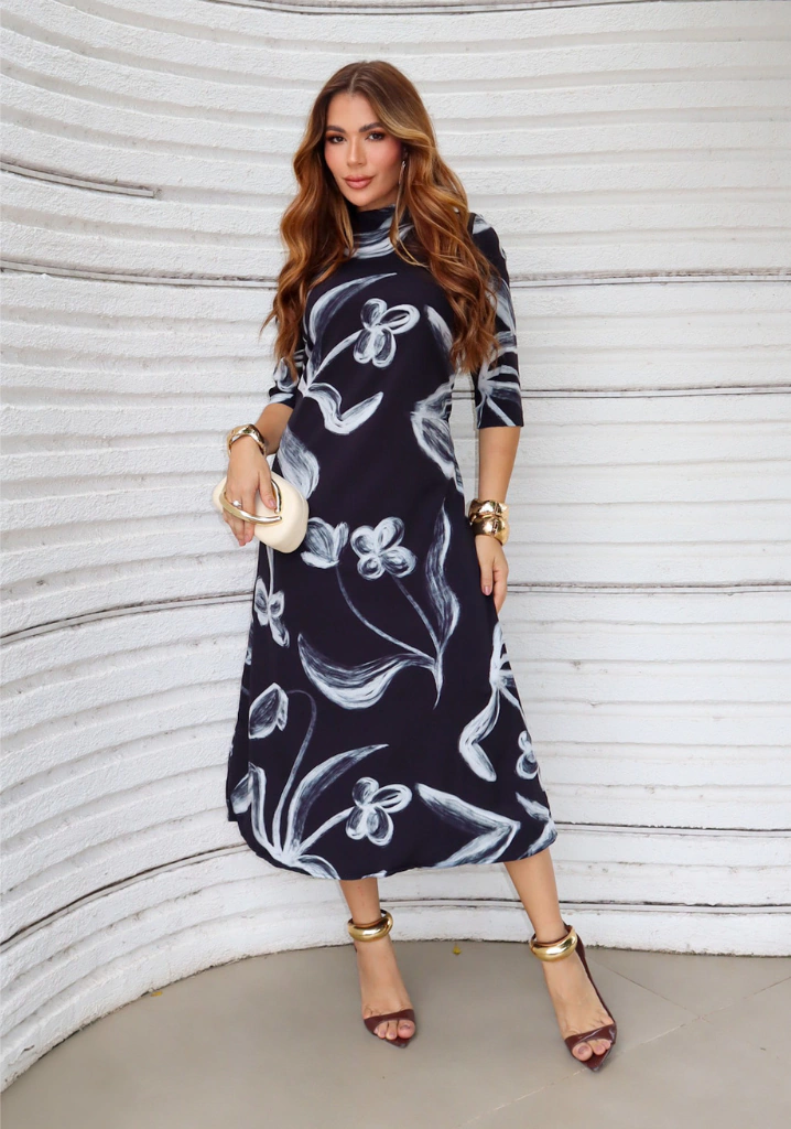 Seu design conta com uma fenda lateral que adiciona sensualidade e movimento, enquanto a gola alta confere charme e sofisticação ao look. A modelagem longa alonga a silhueta, garantindo conforto e estilo em uma só peça.